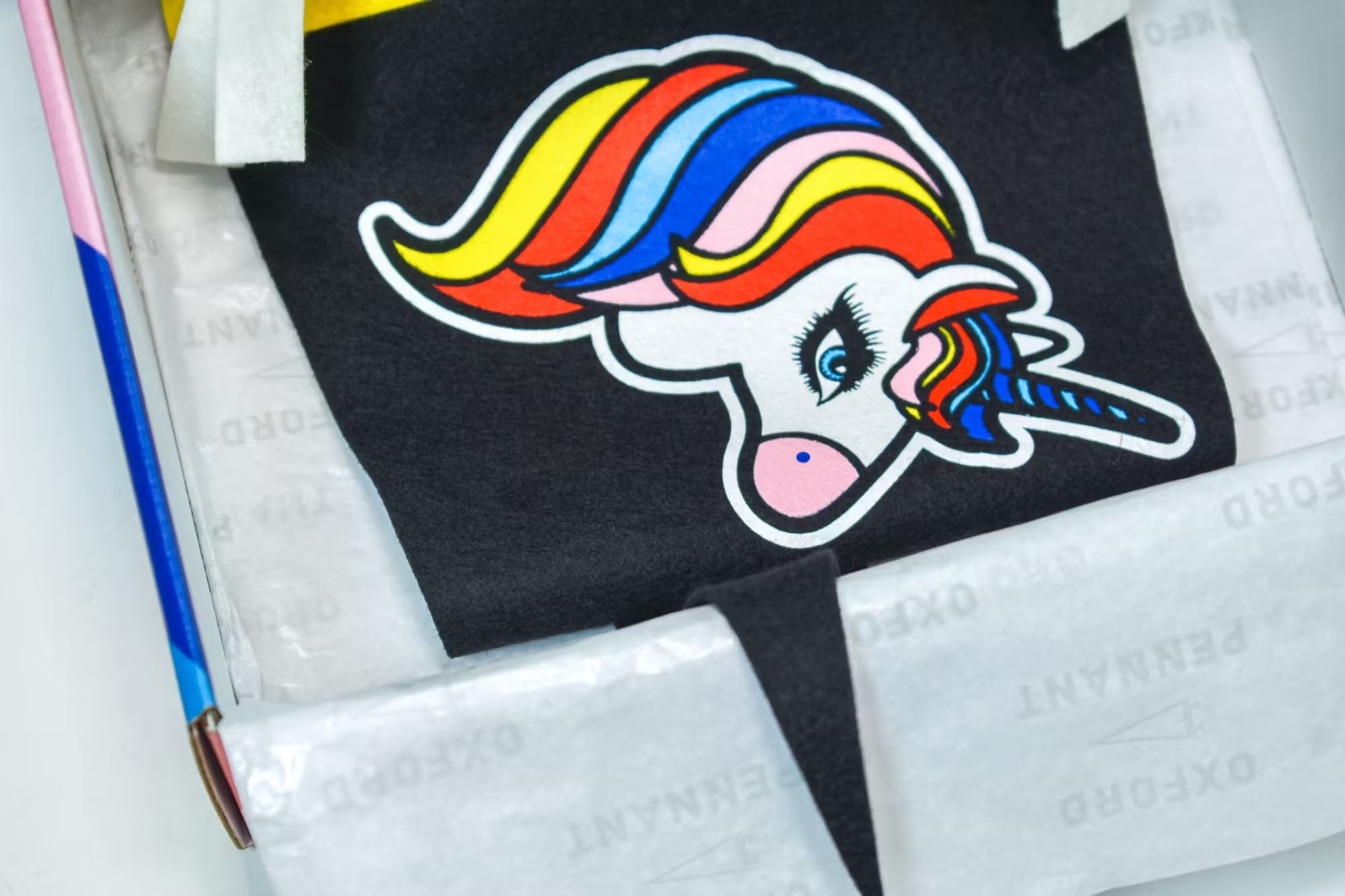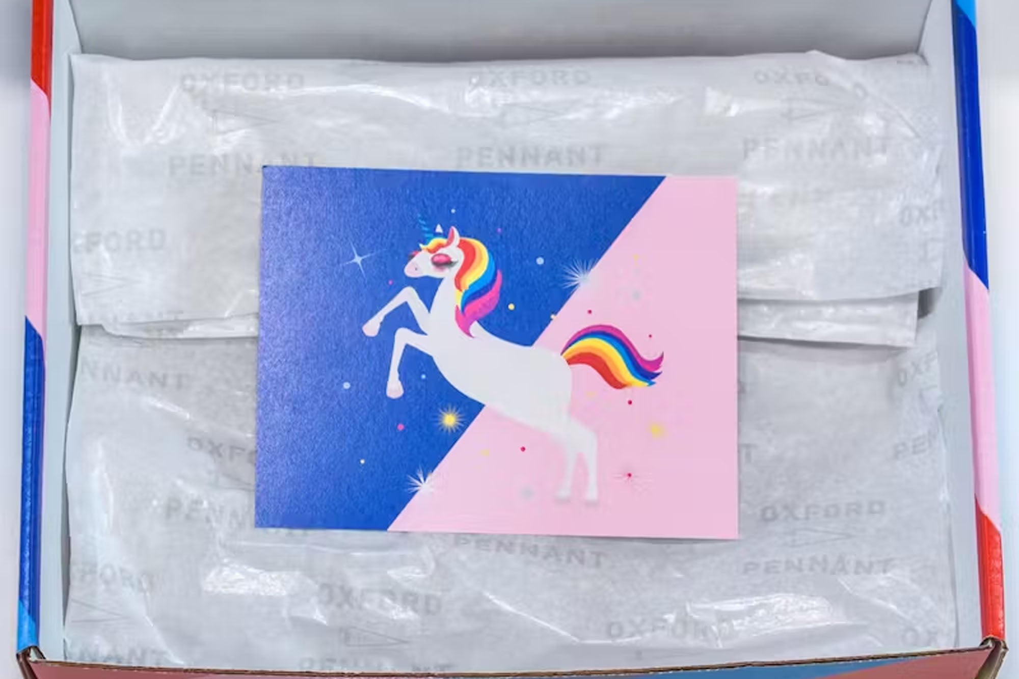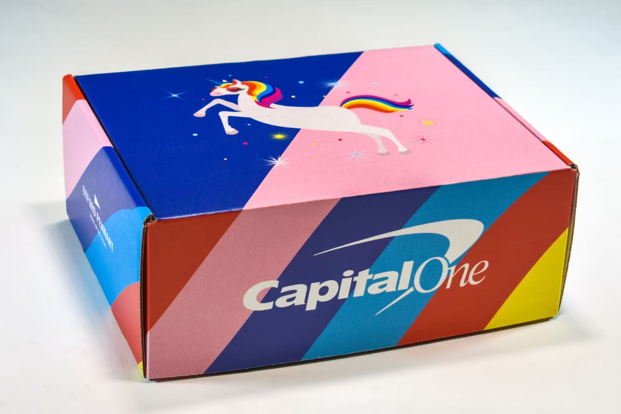 The first step in the process was designing custom pennants, which featured OnePatent’s brightly colored unicorn mascot and co-branded tags. Next, we developed a colorful, co-branded box to reflect the joy of the enclosed pennant. Finally, we revamped our pennant care card to feature OnePatent branding and include a special note from Capital One.