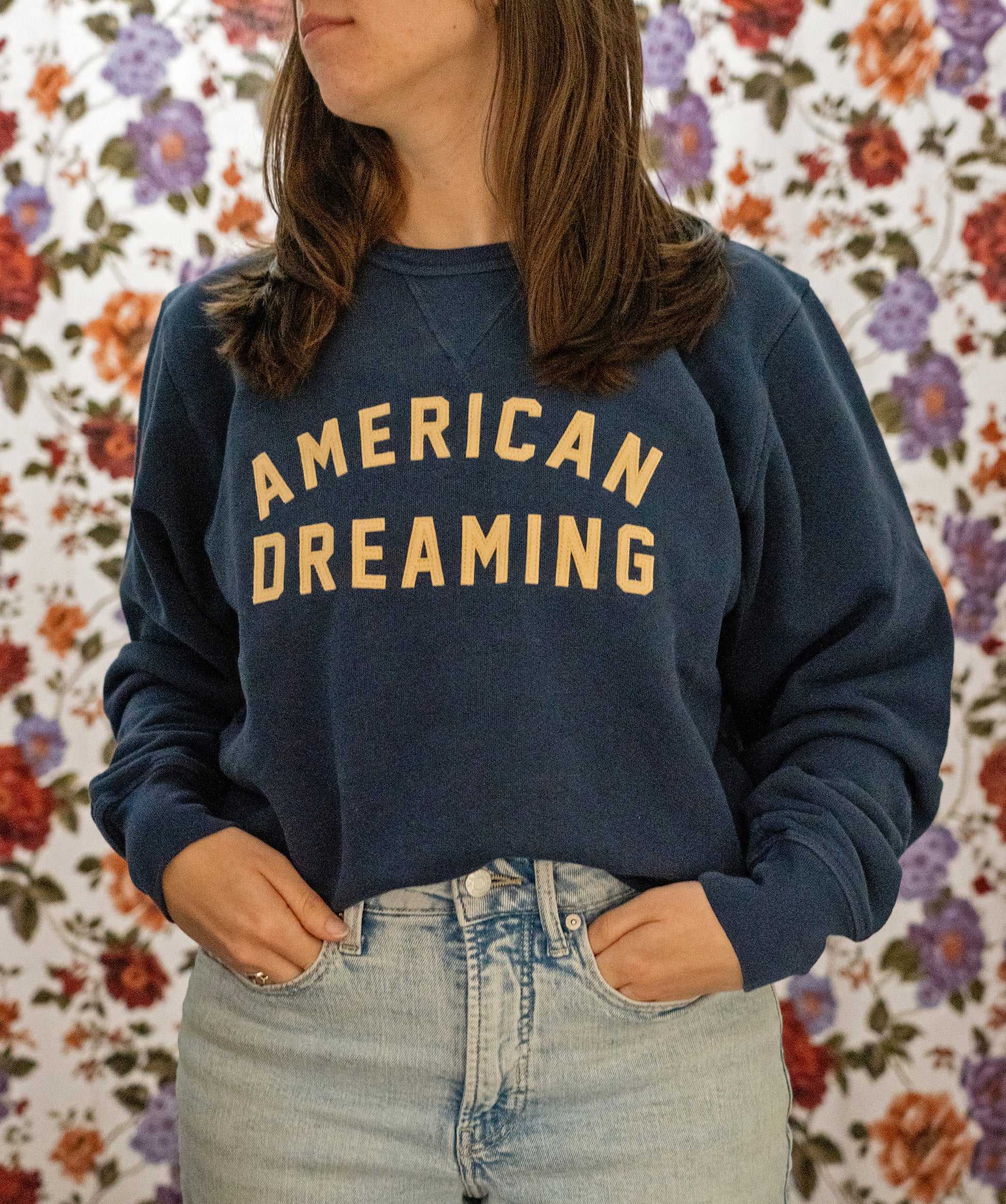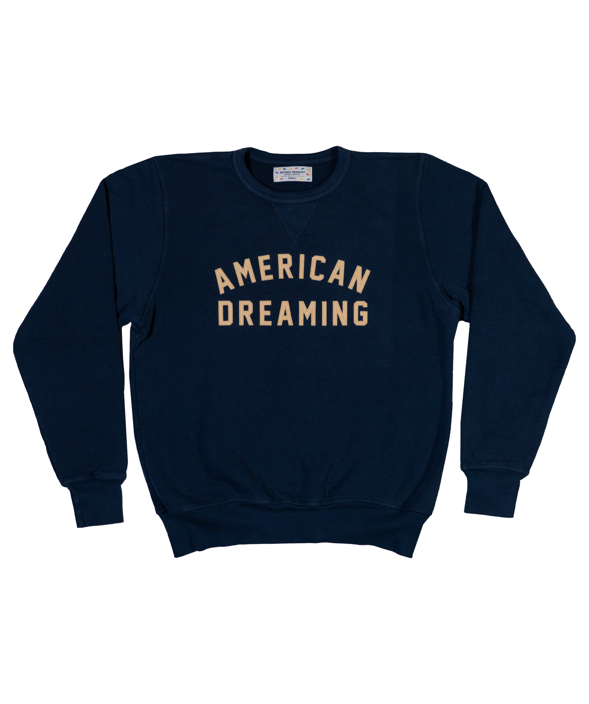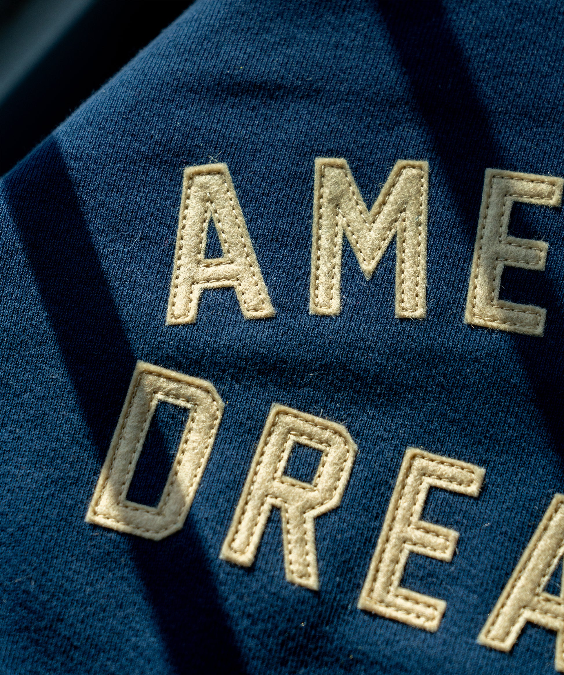 This heavyweight crewneck features "American Dreaming" in hand-sewn sandcastle appliqué lettering on a navy 100% cotton loop back French terry sweatshirt. The kind of thing you wear to the show, on the road, or anywhere the dream is still alive.