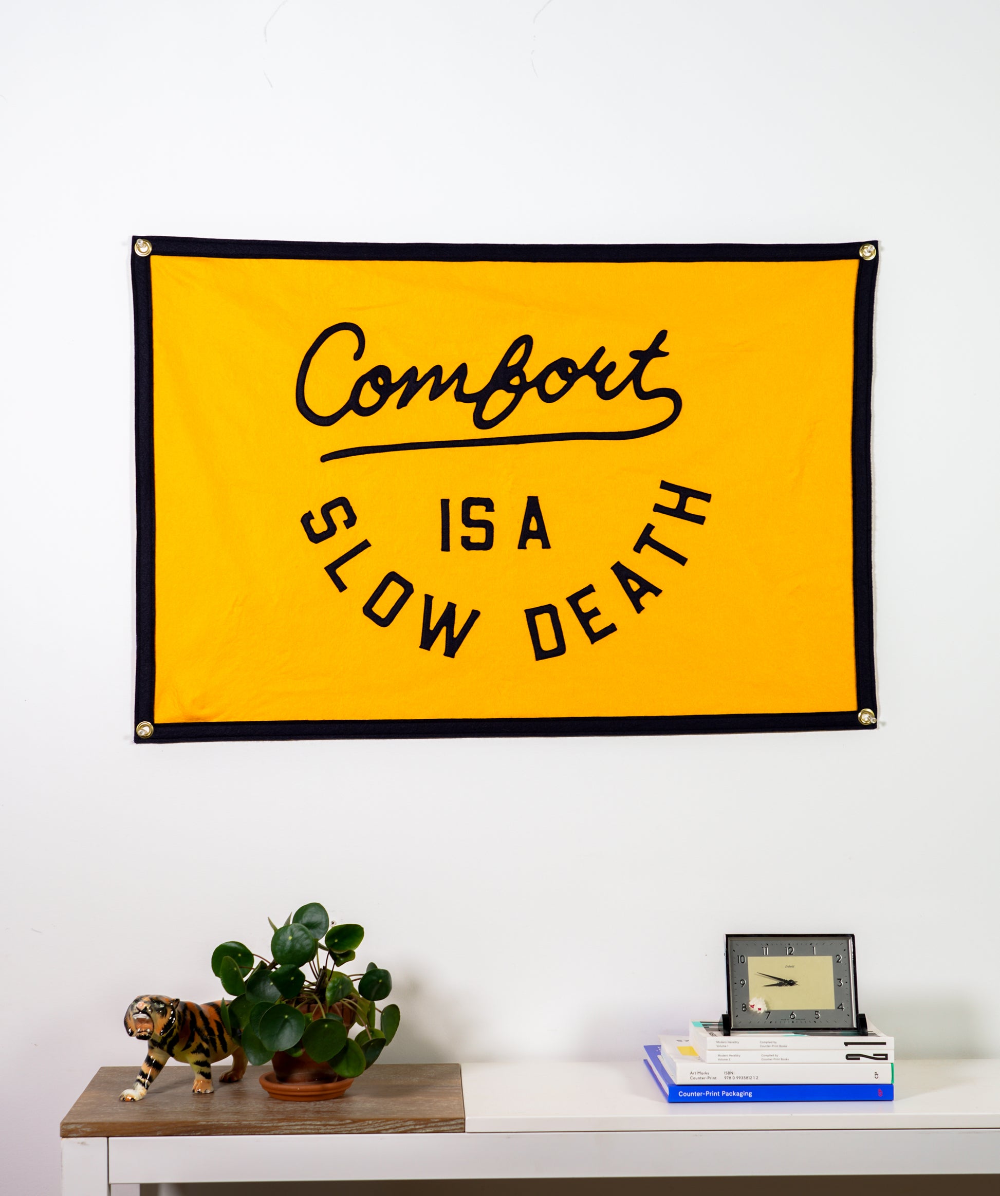 Growth happens outside of your comfort zone, and it’s hard to grasp how much living you might be missing out on by staying in it. All yourself to experience the fullness of life with this gold and black banner designed by Mark Richardson.