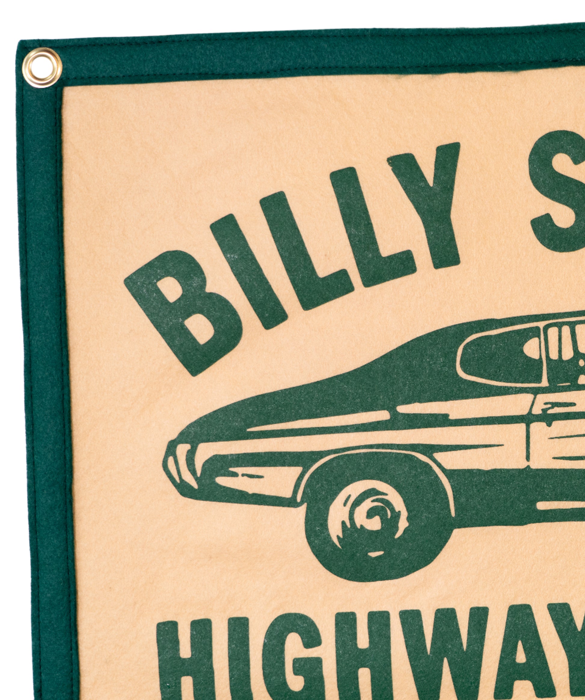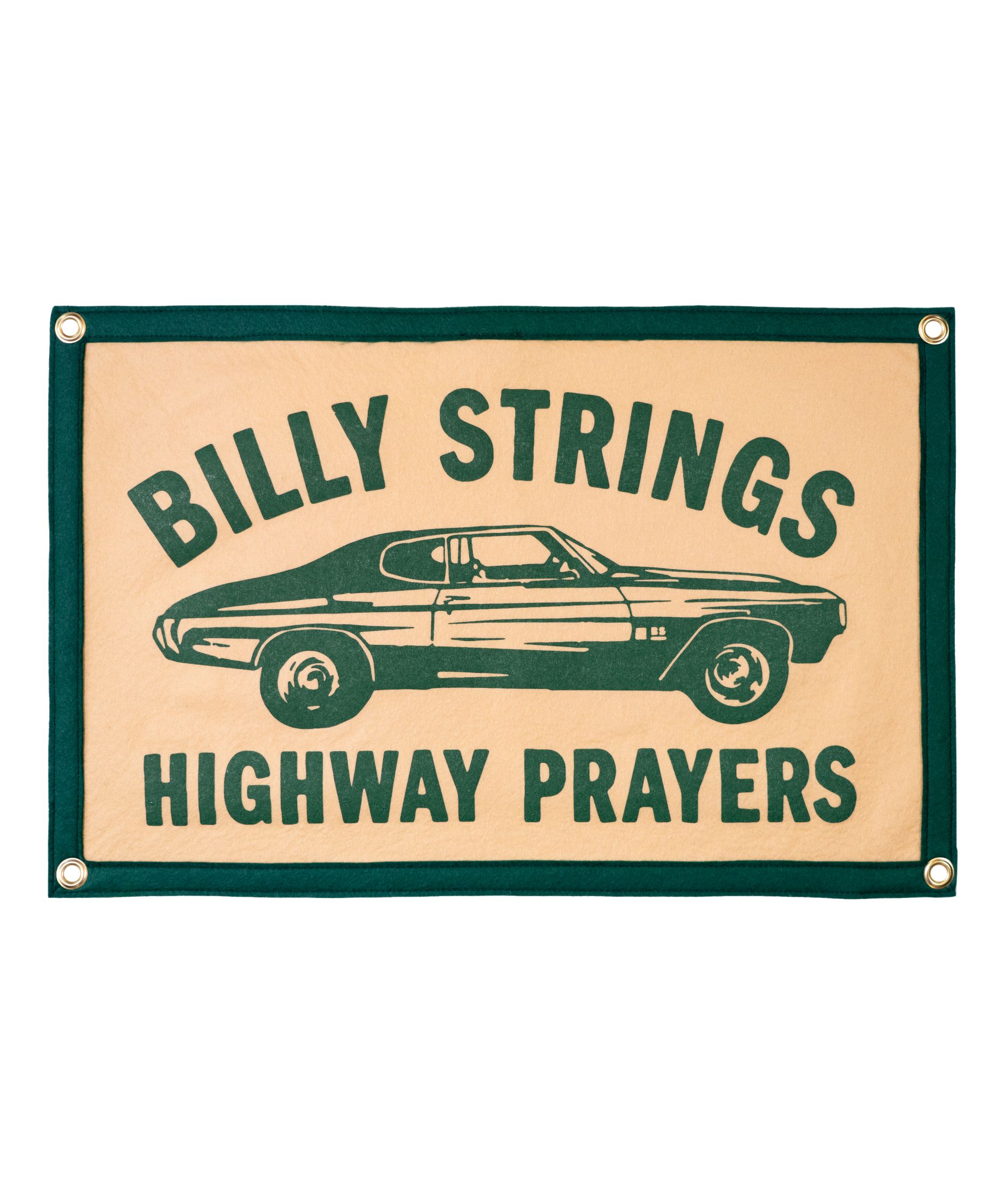 Gas up, turn up the tunes, and hit the open road. This sandcastle and green camp flag, featuring a hand-drawn vintage muscle car, is inspired by Billy Strings’ Highway Prayers. Hang it in your home, garage, or anywhere that calls for long drives and late-night jams.