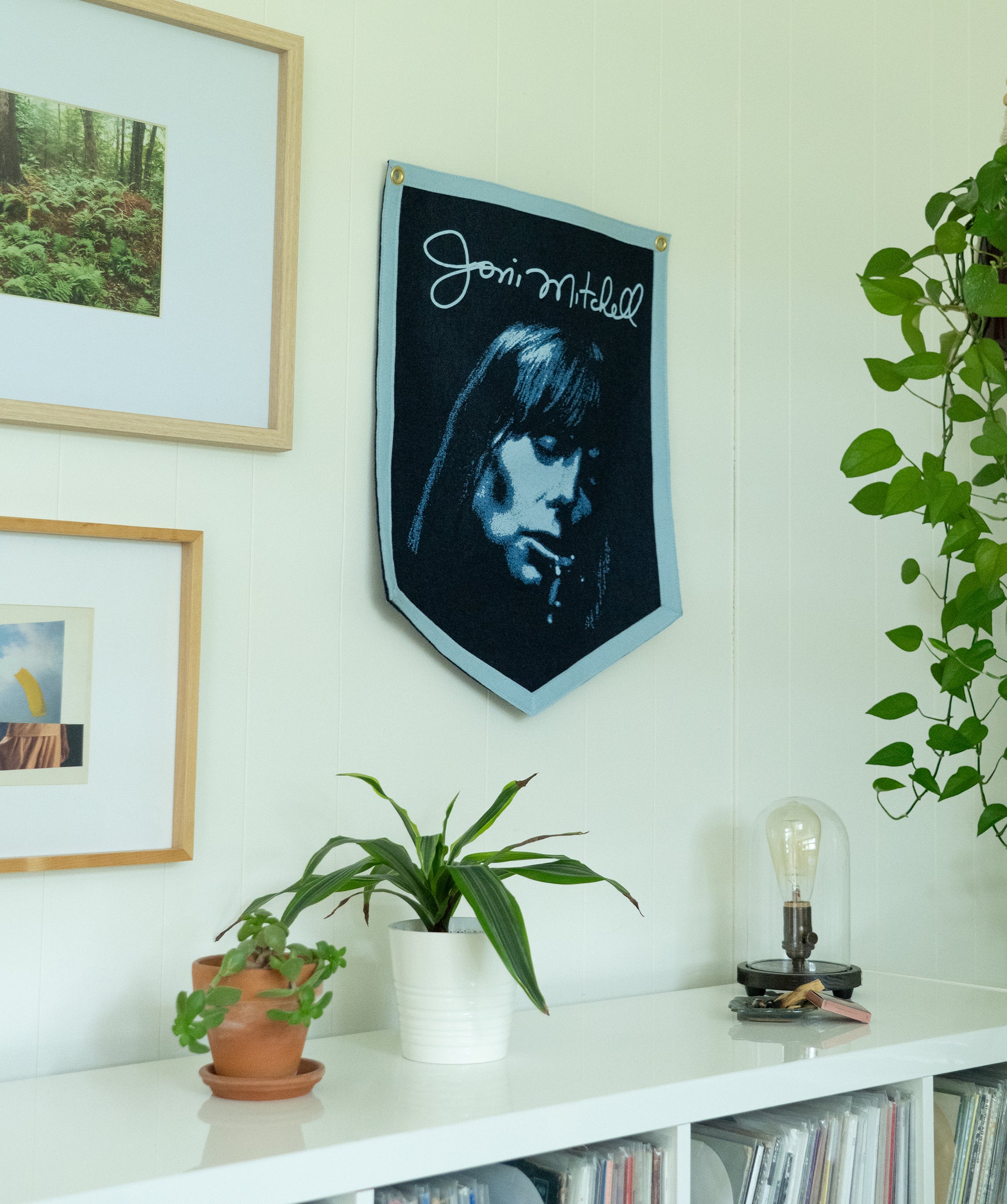 This handmade camp flag honors the timeless work of Joni Mitchell’s Blue, featuring her portrait and her signature graceful script. Hang it where you keep your most treasured music close.