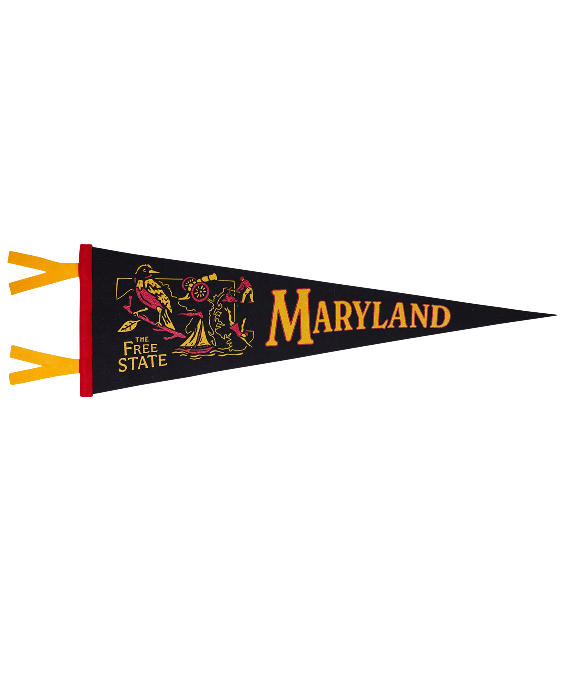This black, red, and gold pennant features a number of illustrations honoring Maryland's rich history as well as its state bird, the Baltimore Oriole.