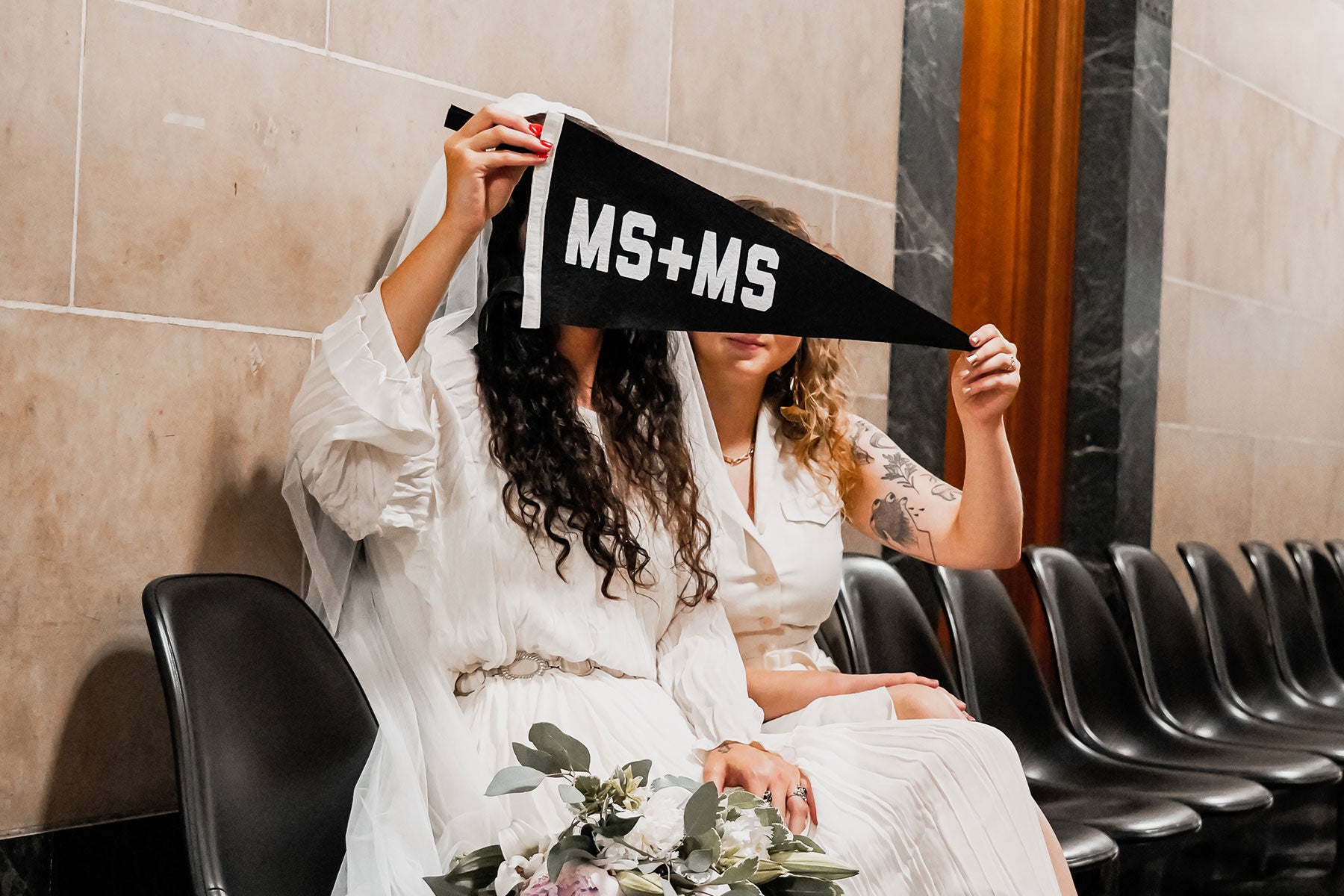 You may now kiss the bride (twice over)! Share your new marital bliss—while maintaining your maiden names—with this simple black and white pennant.