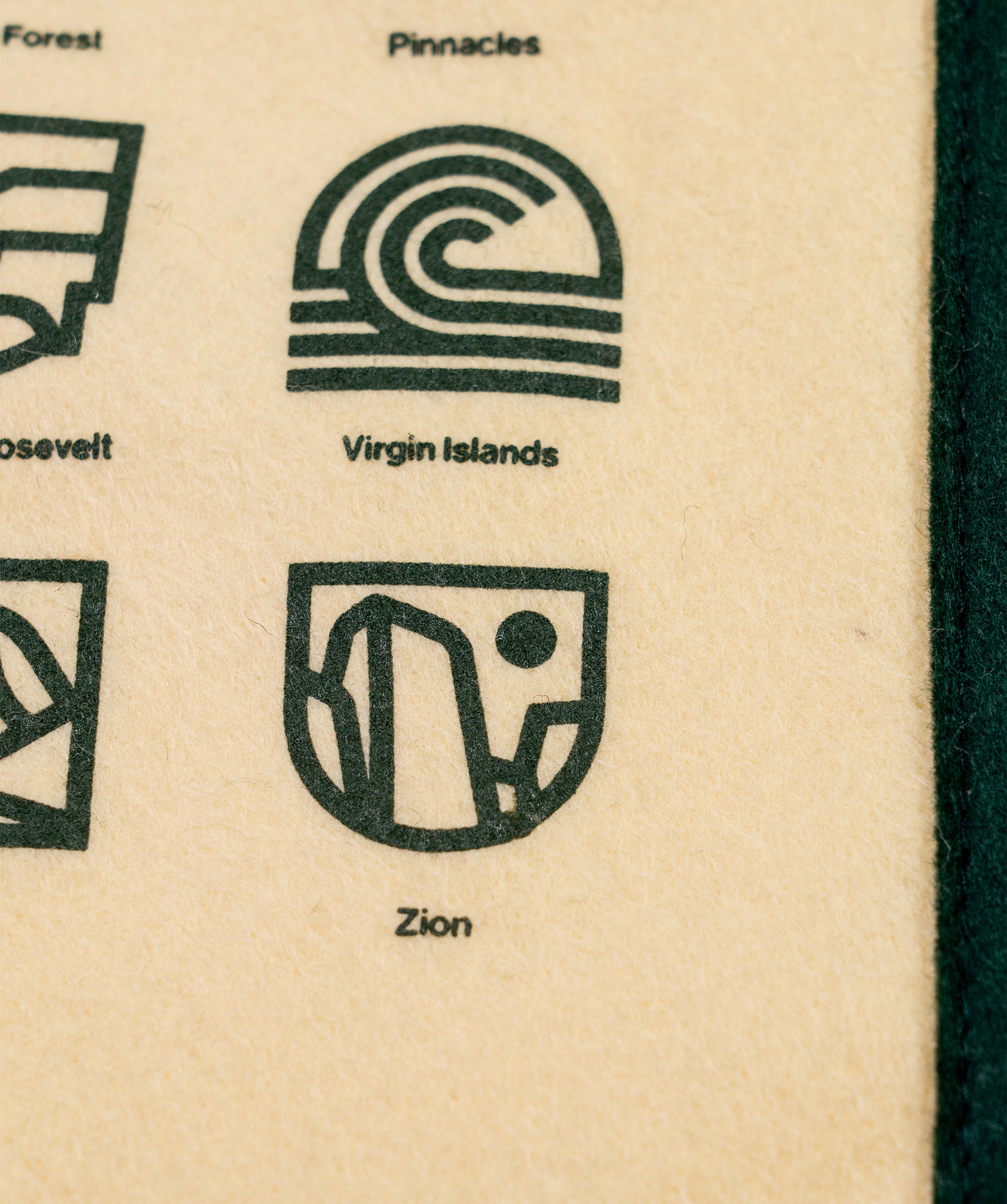 Proud friend of Oxford Pennant Steve Wolf has created simple, beautiful logos for all 63 National Parks. Even the ones you haven't heard of! Wolf's complete set of logos now comes to life on this handmade cream and forest green camp flag.