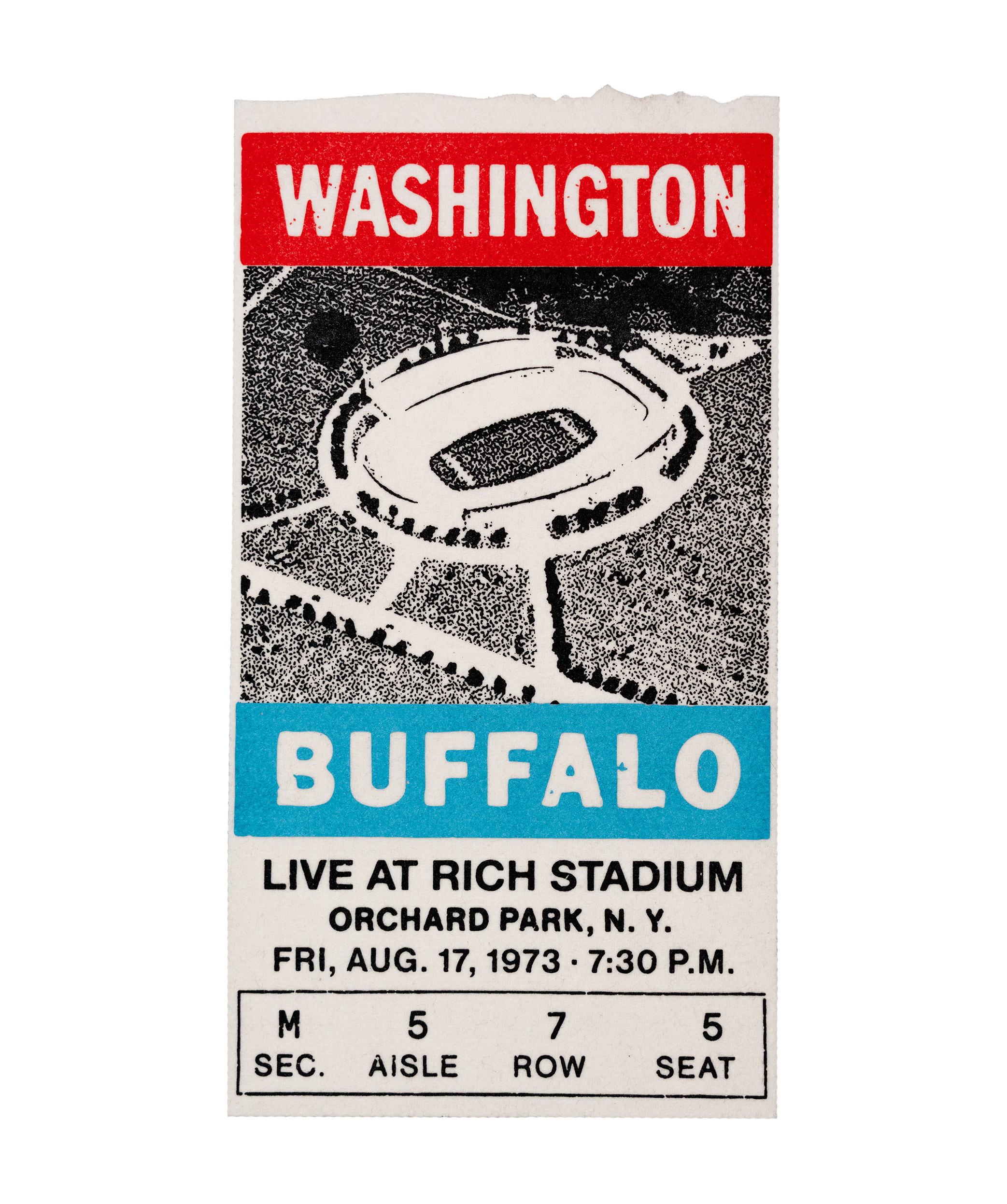 The Rich Stadium Big Ticket is an oversized print on scrim felt based on an original 1973 game ticket from the opening day Buffalo vs. Washington match up. Designed to commemorate and celebrate Rich Stadium’s early history.