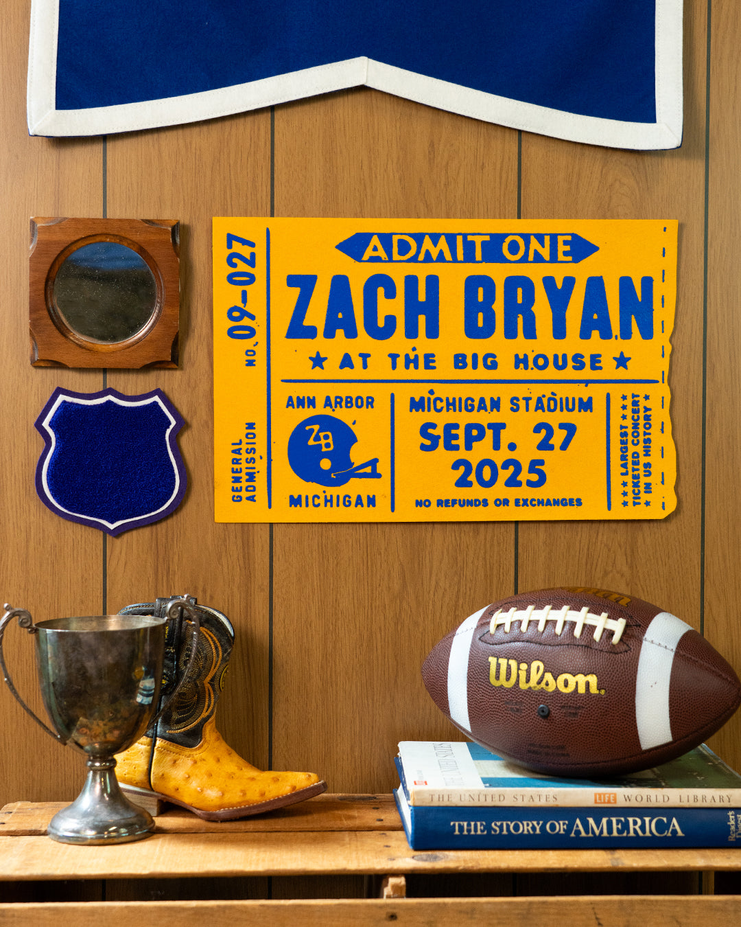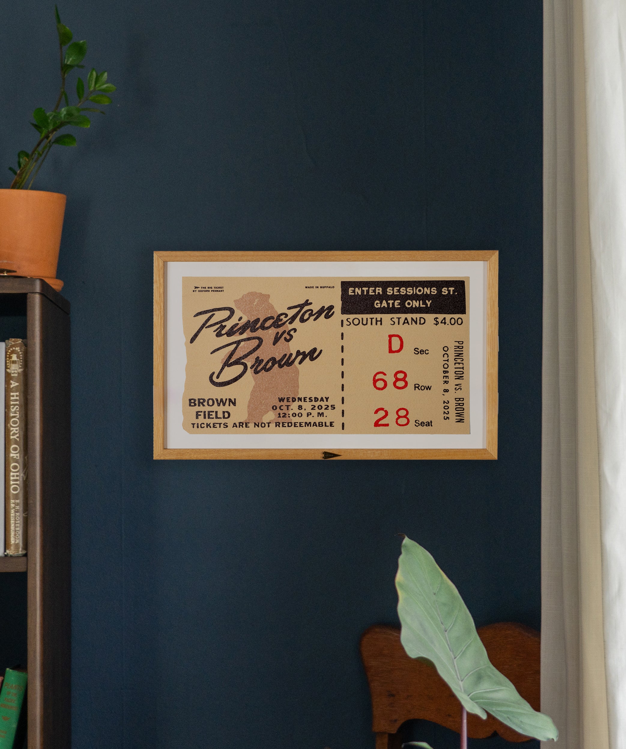 Big Tickets are the newest silhouette in the Oxford Pennant product line. Inspired by a time when event tickets were physical keepsakes, these pieces bring that feeling back in the age of digital tickets. Made with scrim felt, Big Tickets can be framed or hung as-is to commemorate an important game or the best show you’ve ever been to. Each Big Ticket features an original design printed at our manufacturing studio in Buffalo, NY.