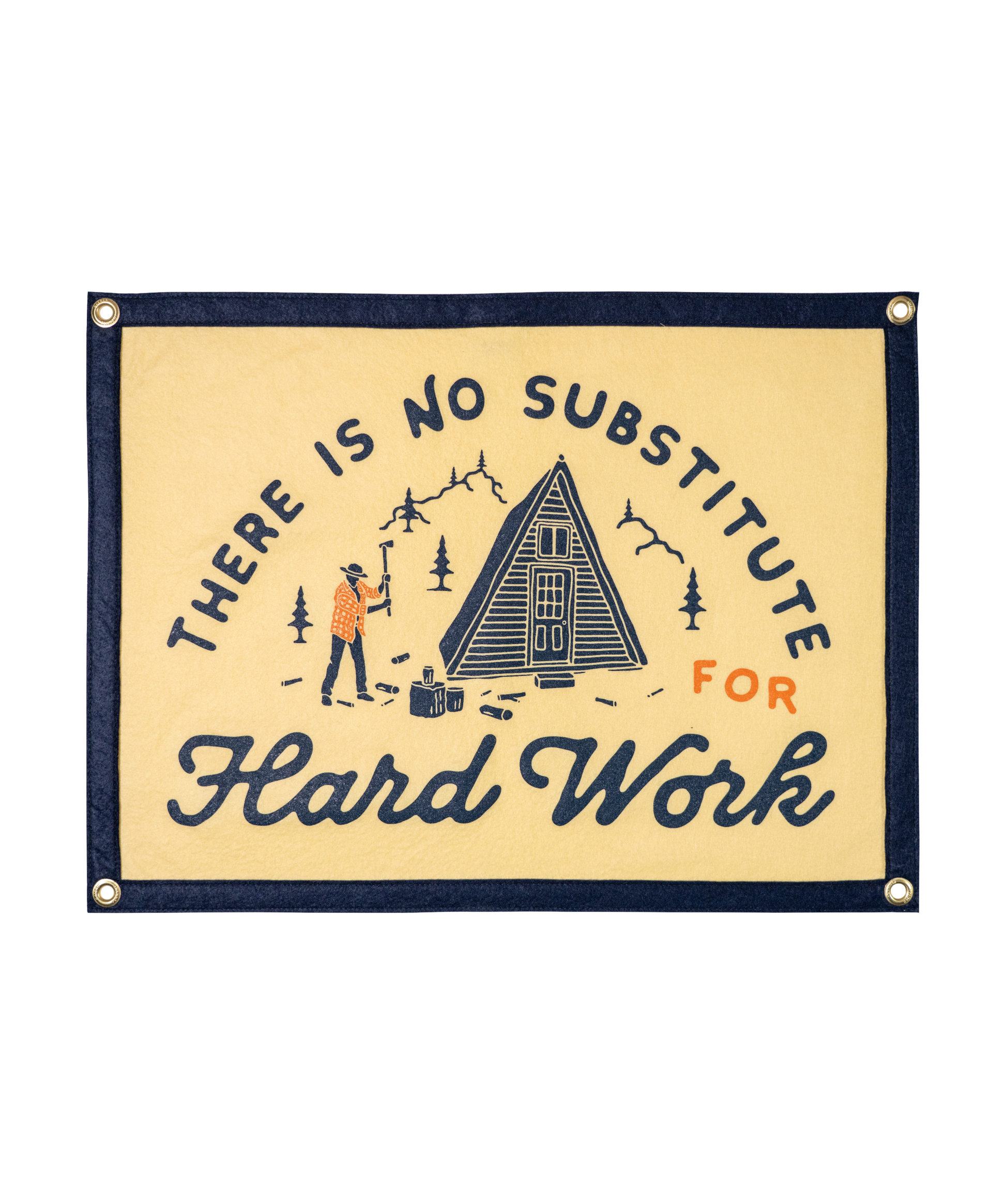 Taking shortcuts isn’t the path to good quality results. A job truly well done often requires blood, sweat, and tears. Remind folks of the importance of a strong work ethic with this cream camp flag featuring an illustration of a person chopping wood outside of their A-frame home.