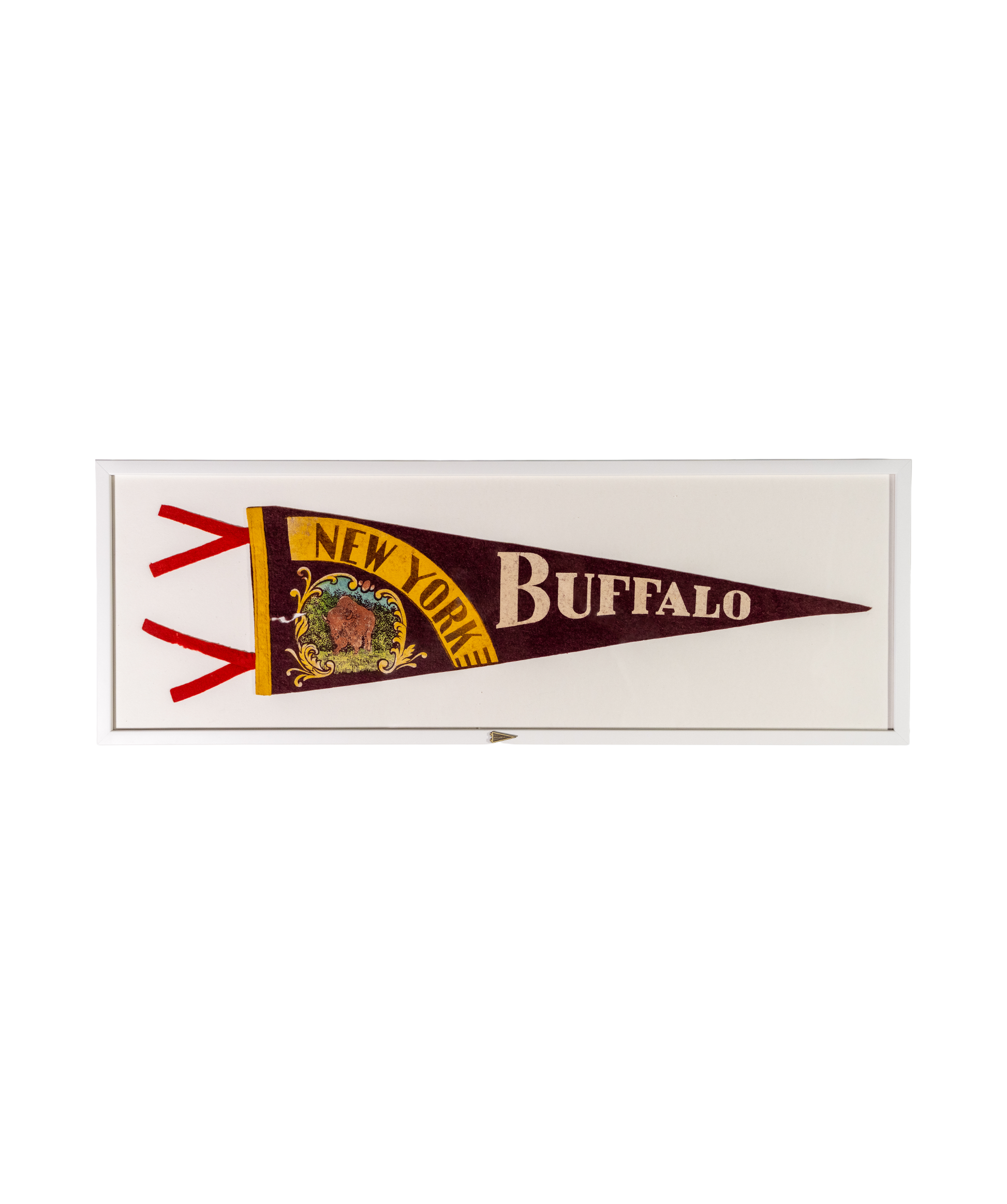 Celebrate your love of the Queen City with this vintage wool felt pennant. Expertly preserved in a white frame, it adds a touch of Buffalo's history to any home. This vintage pennant arrives framed and ready to hang.